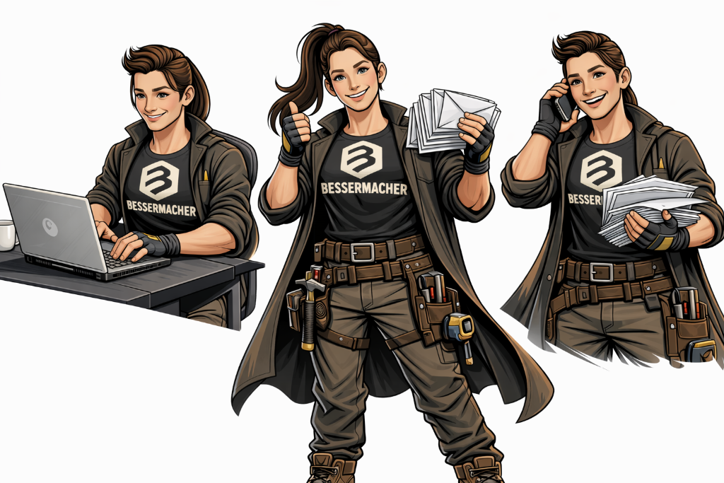 Wir BESSERMACHER Betriebe sind Mo-Fr zwischen 07:30 und 17:30 Uhr erreichbar. Antworten auf Mails erhalten unsere Kunden -und die die es werden wollen- binnen 24 Stunden, garantiert!